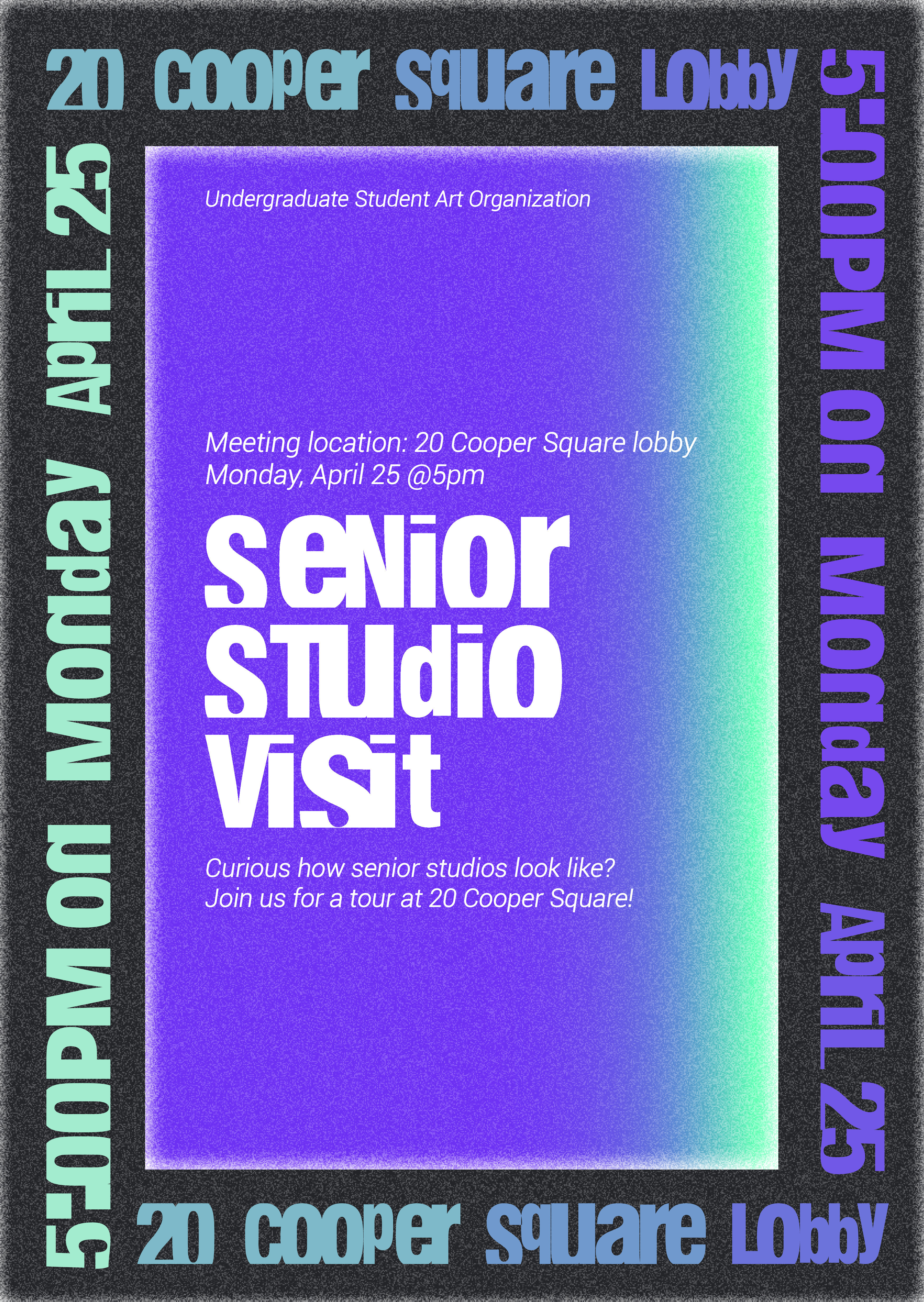 As the poster designer of Undergraduate Studio Art Organization, I have designed a set of poster for different events and announcement. posters were displayed in the Barney Building of NYU as well as Official Instagram of School of Steinhardt, Studio Art account.