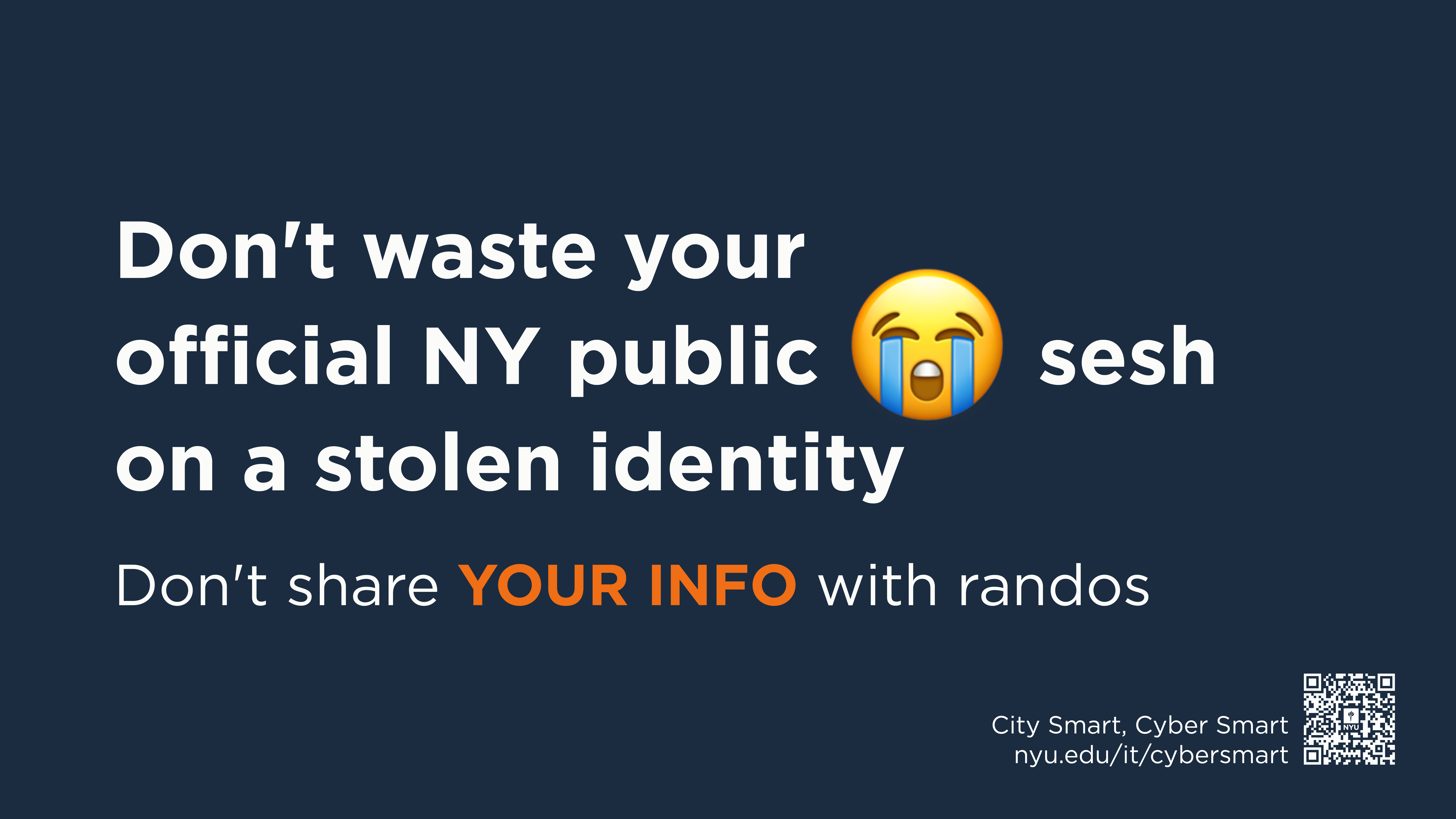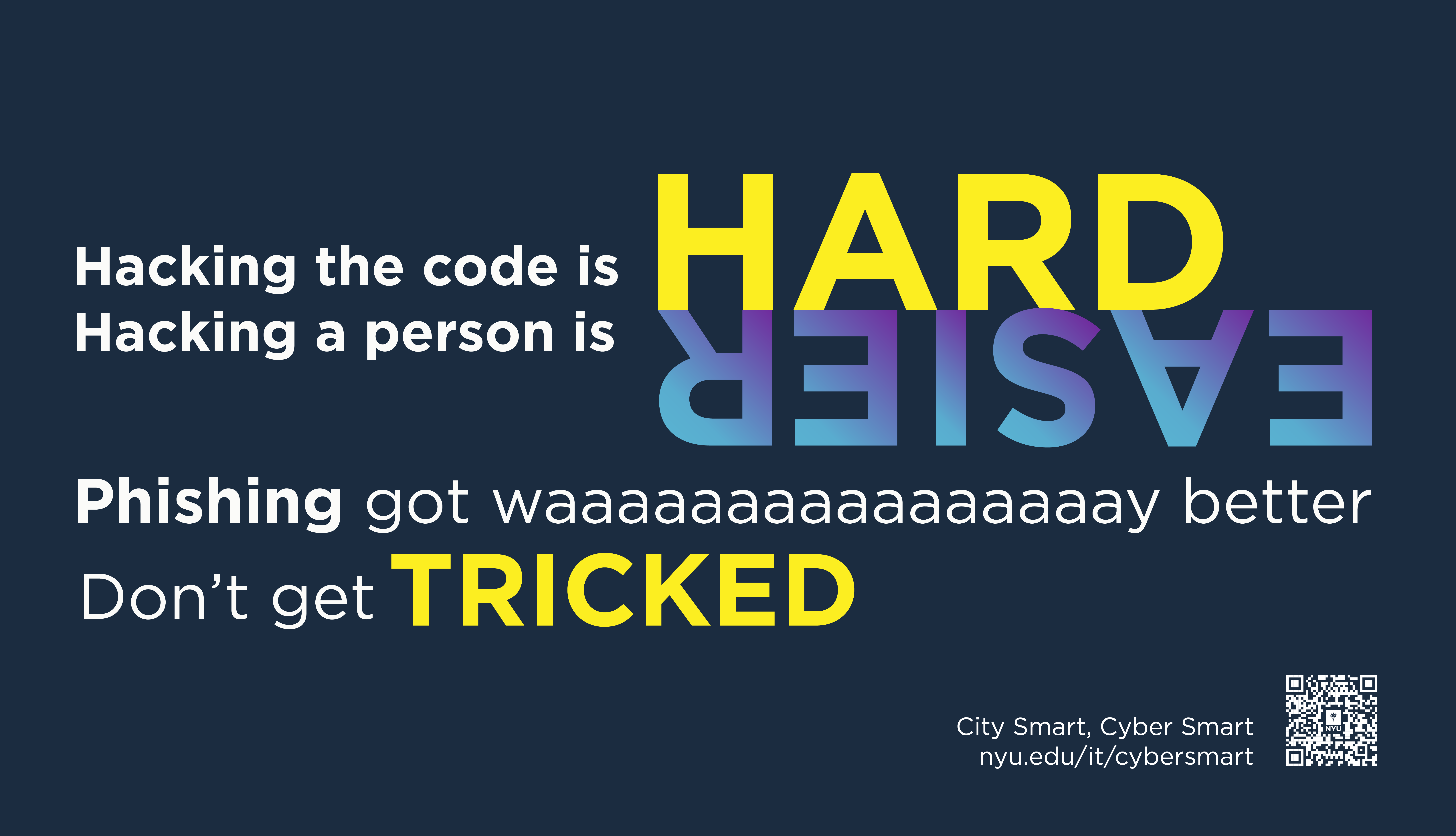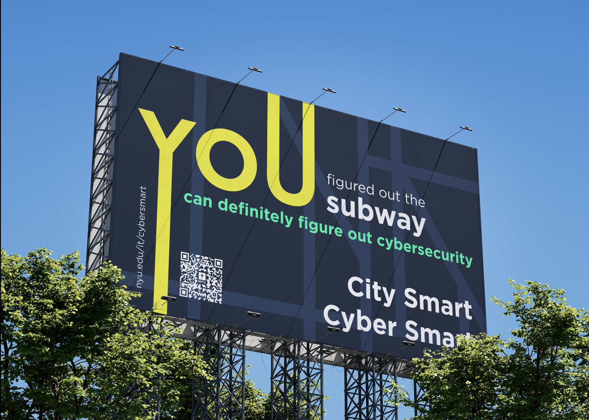For NYU IT’s 2023 "City Smart, Cyber Smart" campaign, I designed over 40 signage pieces that paralleled NYC’s MTA system with cybersecurity. Using track lines, route numbers, and bold colors, the visuals made digital safety feel familiar and navigable. Just like the subway, which may seem chaotic at first but is ultimately learnable, cybersecurity can be approached with the same confidence. The campaign was featured in Educause’s 2024 Horizon Report for its impactful, community-focused approach.