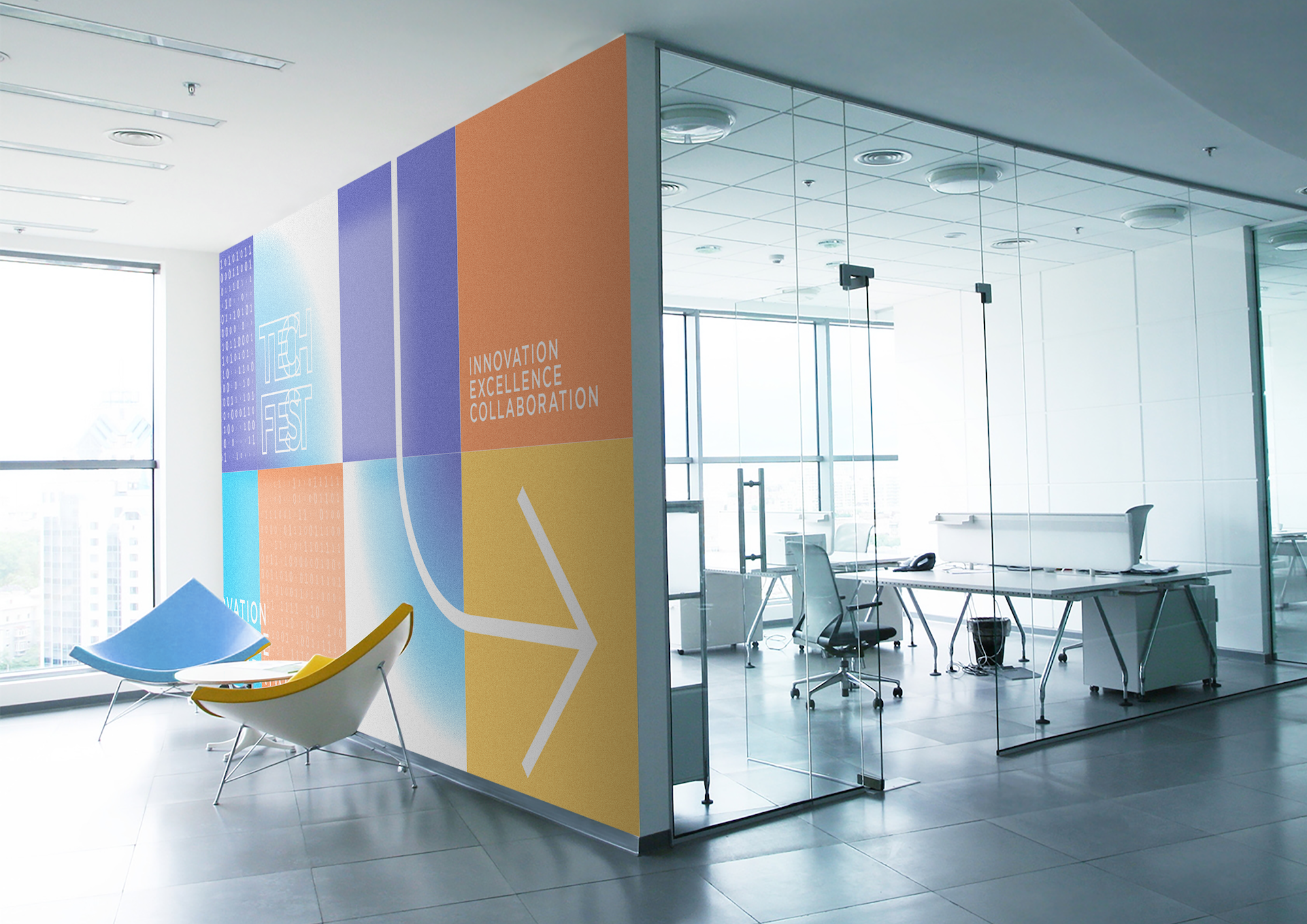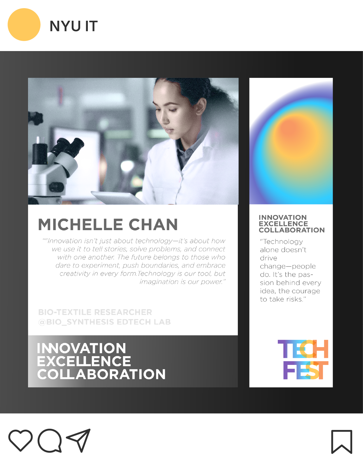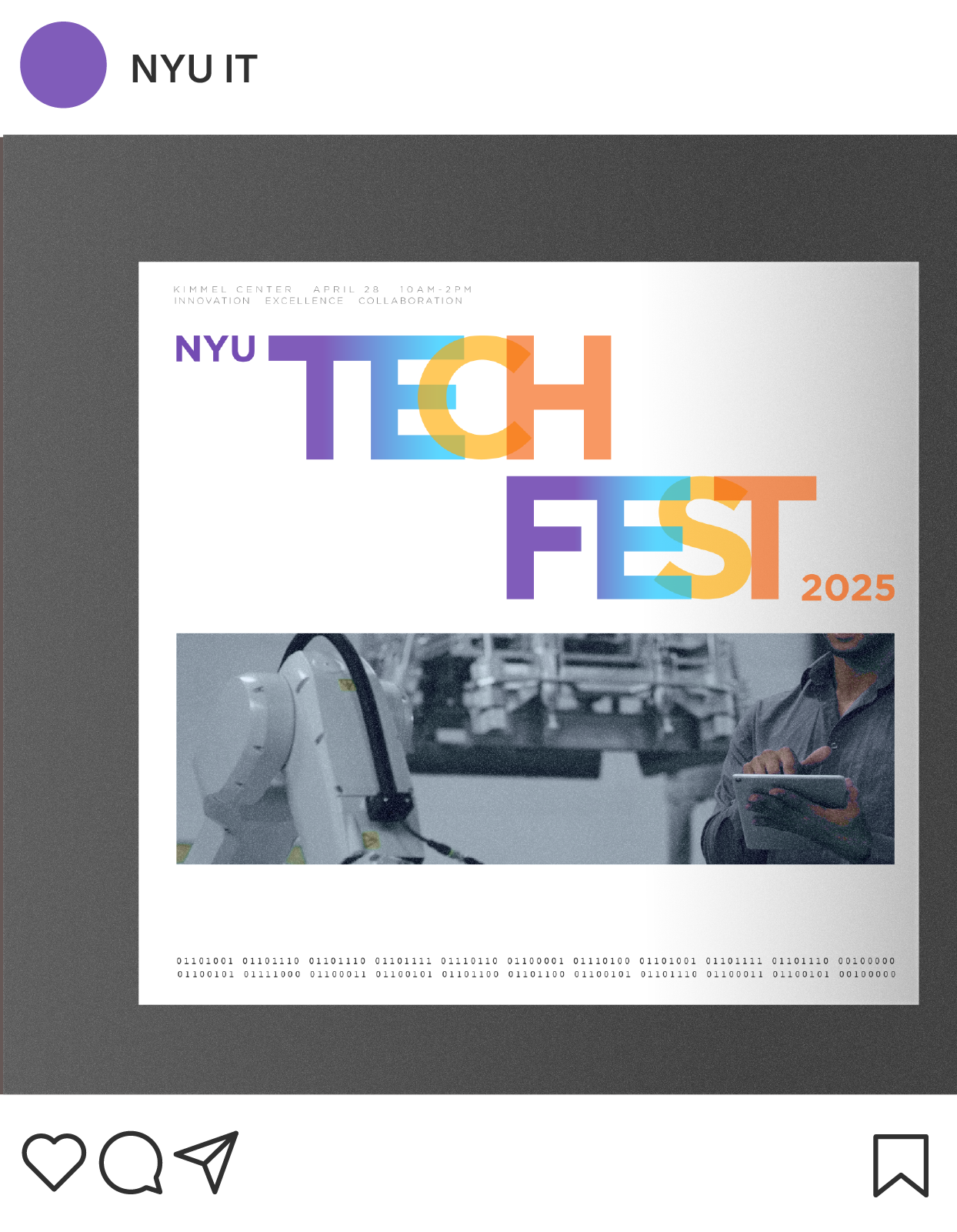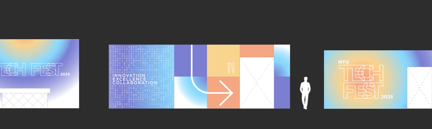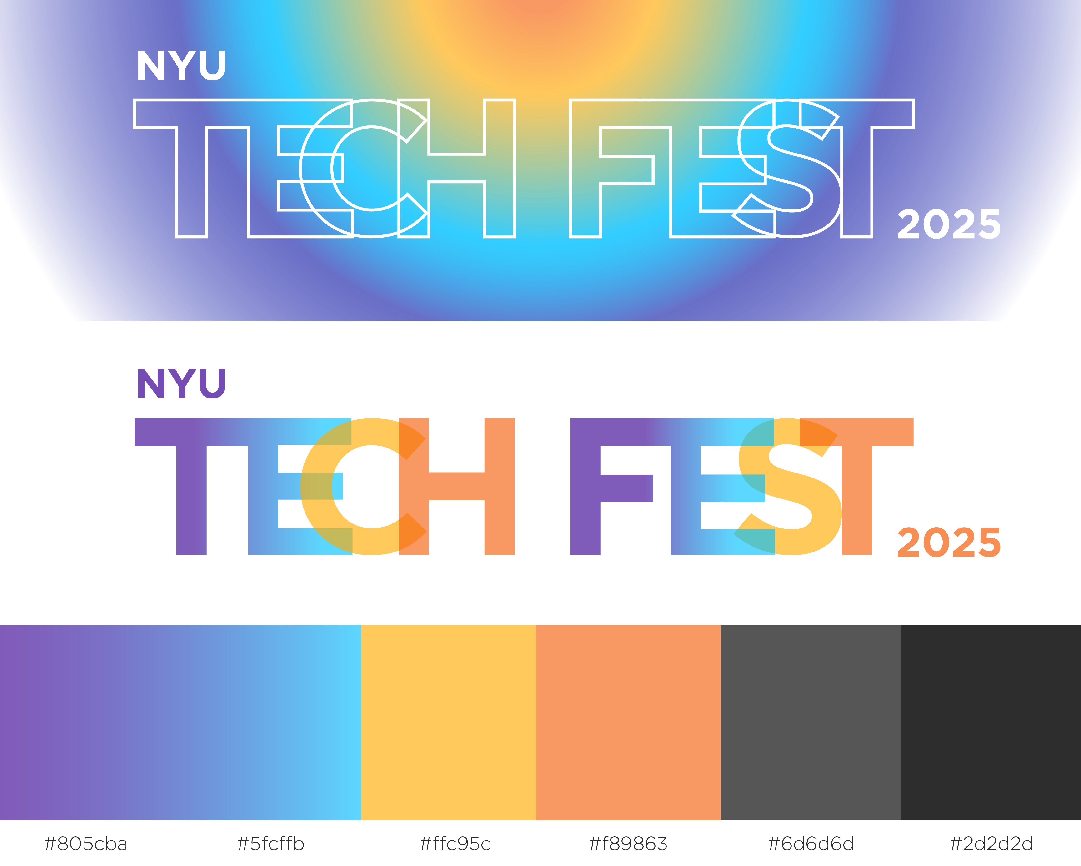 The Tech Fest branding blends color, motion, and the digital realm to convey energy and unity within a modern academic context. NYU purple, alongside blue, yellow, and orange, reflects the university's vibrancy. The gradient from purple and blue to yellow and orange highlights connectivity and the innovative spirit of the event.