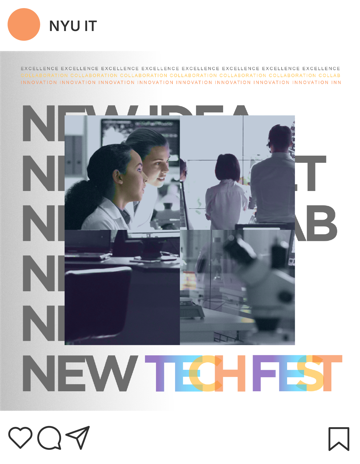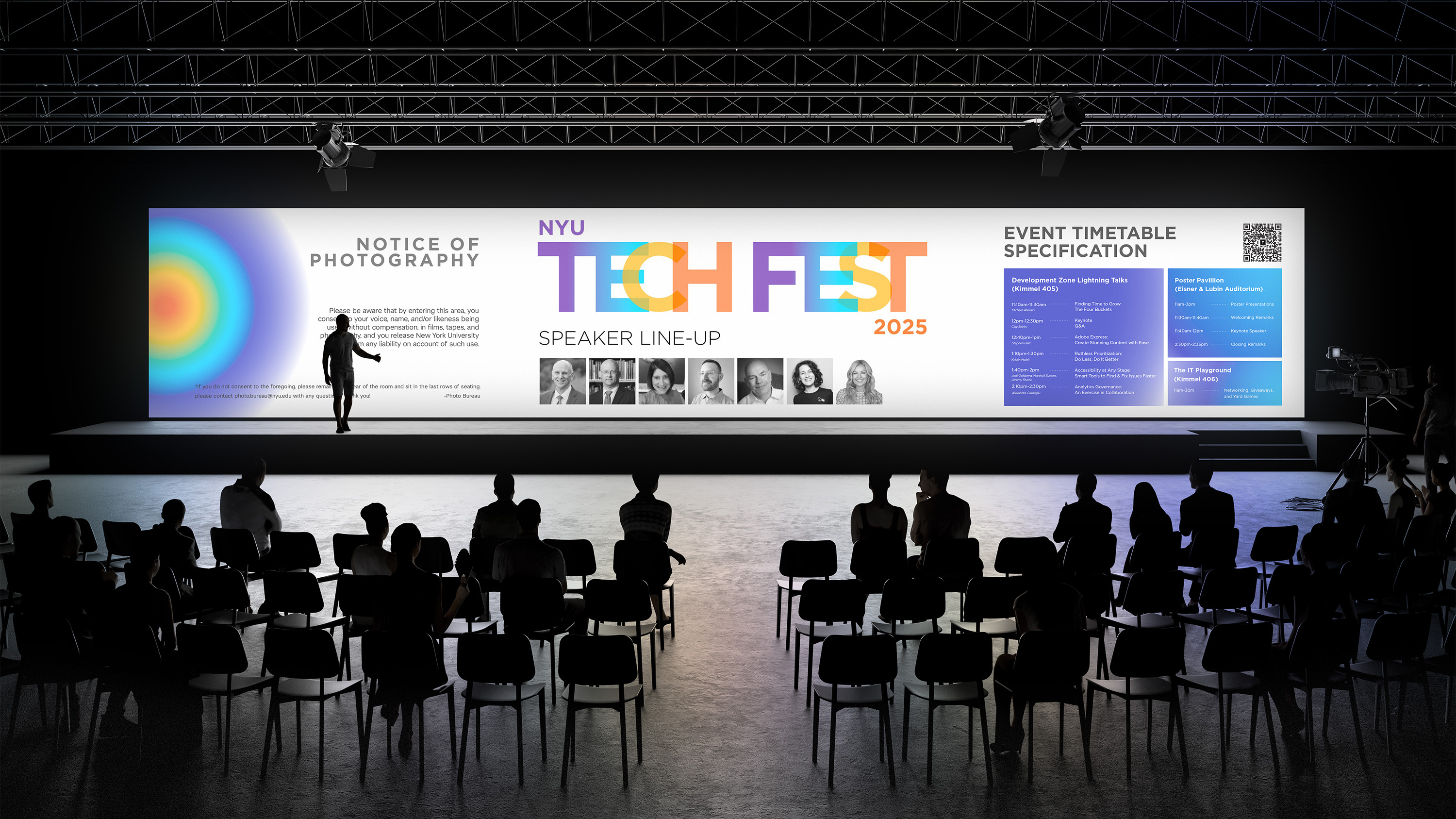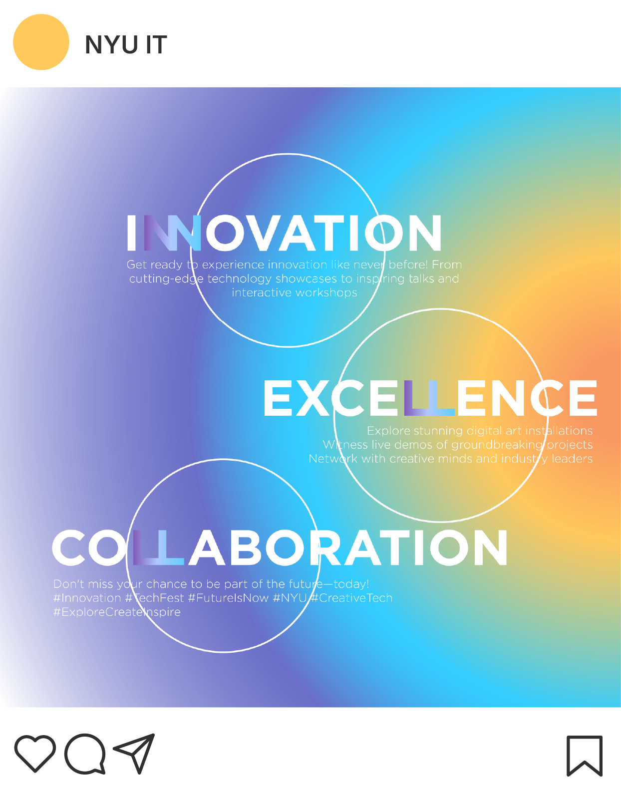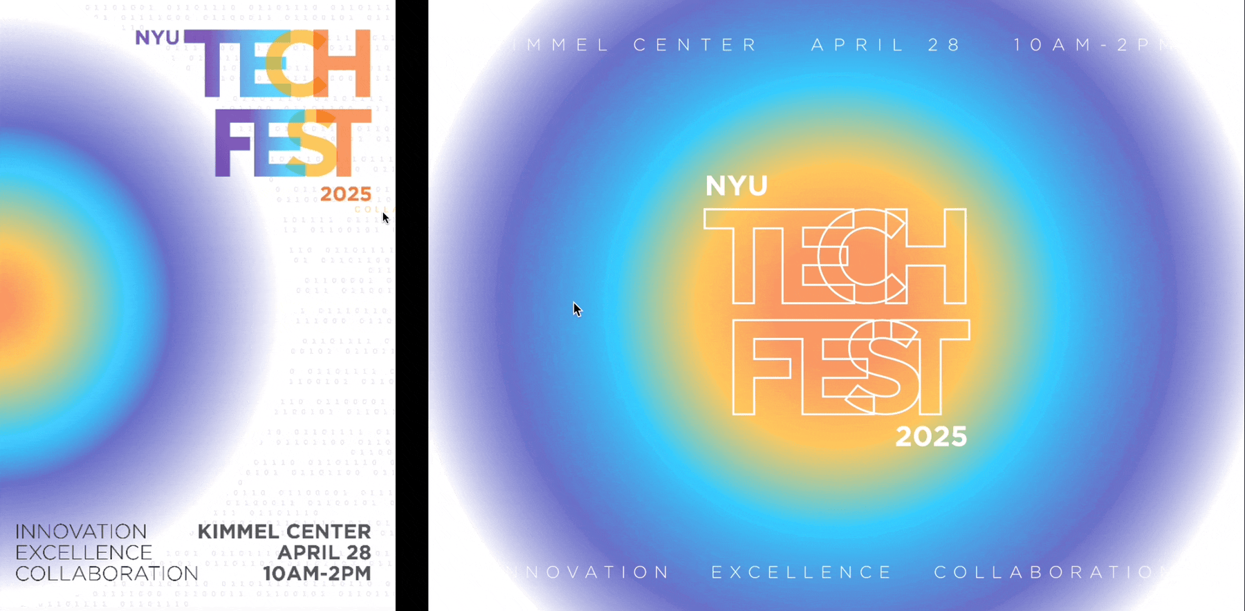 The central gradient circular visual symbolizes the energy of innovation, reflecting the forward-moving nature of technology and its ability to connect and propel us. The design celebrates the future of technology, grounded in NYU’s academic culture.