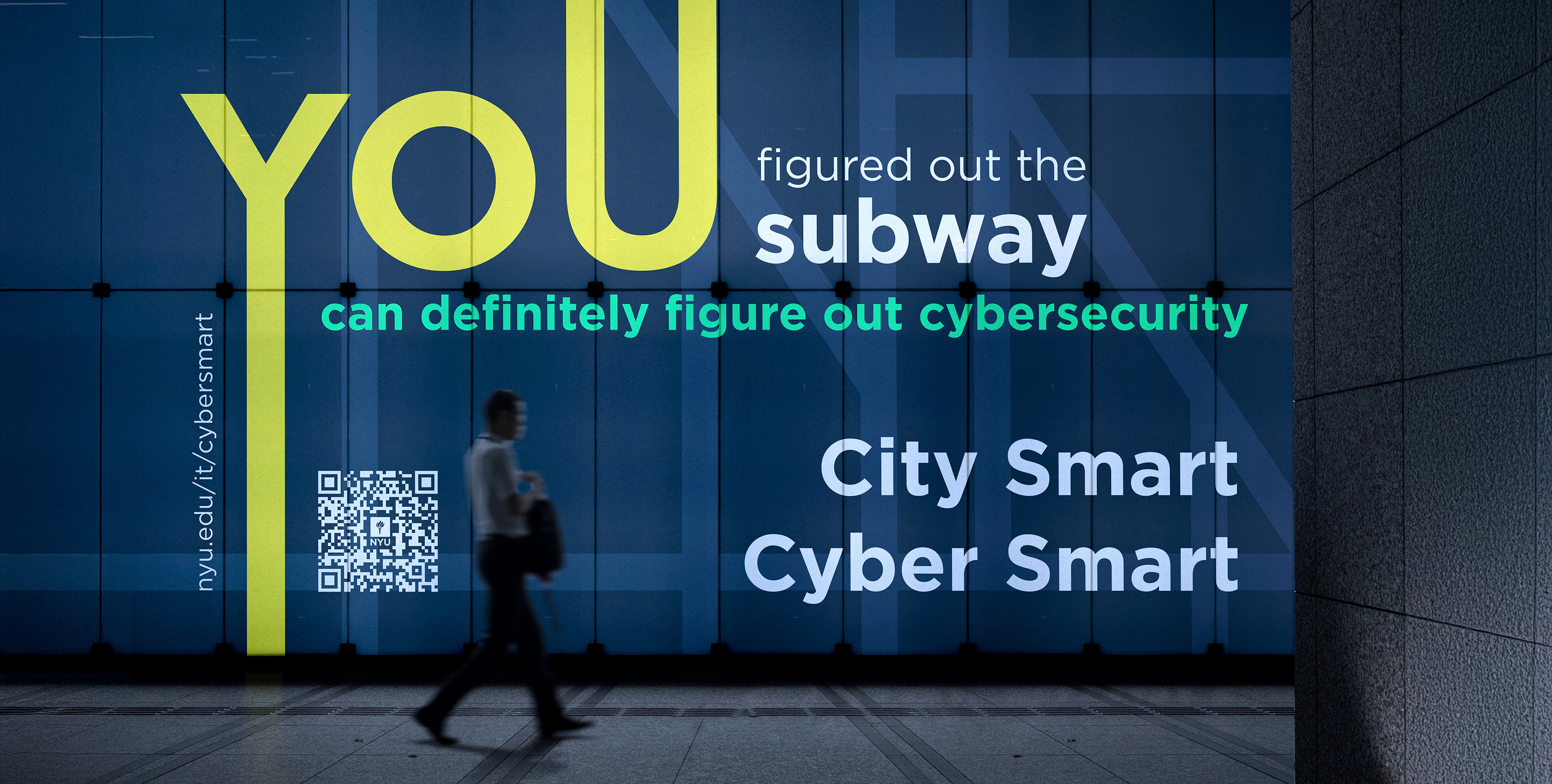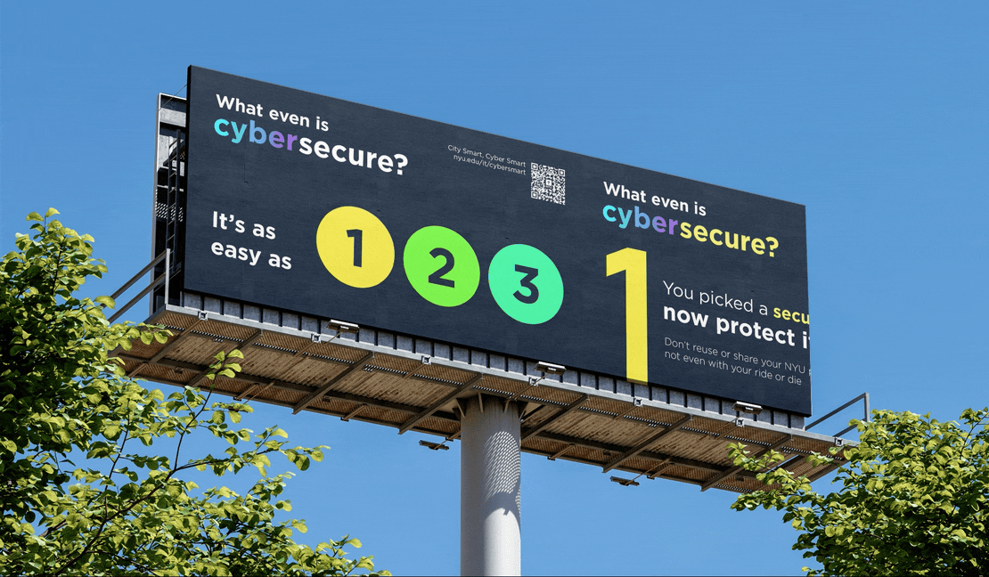A digital signage campaign for NYU IT 2023 "City Smart, CyberSmart" campaign.