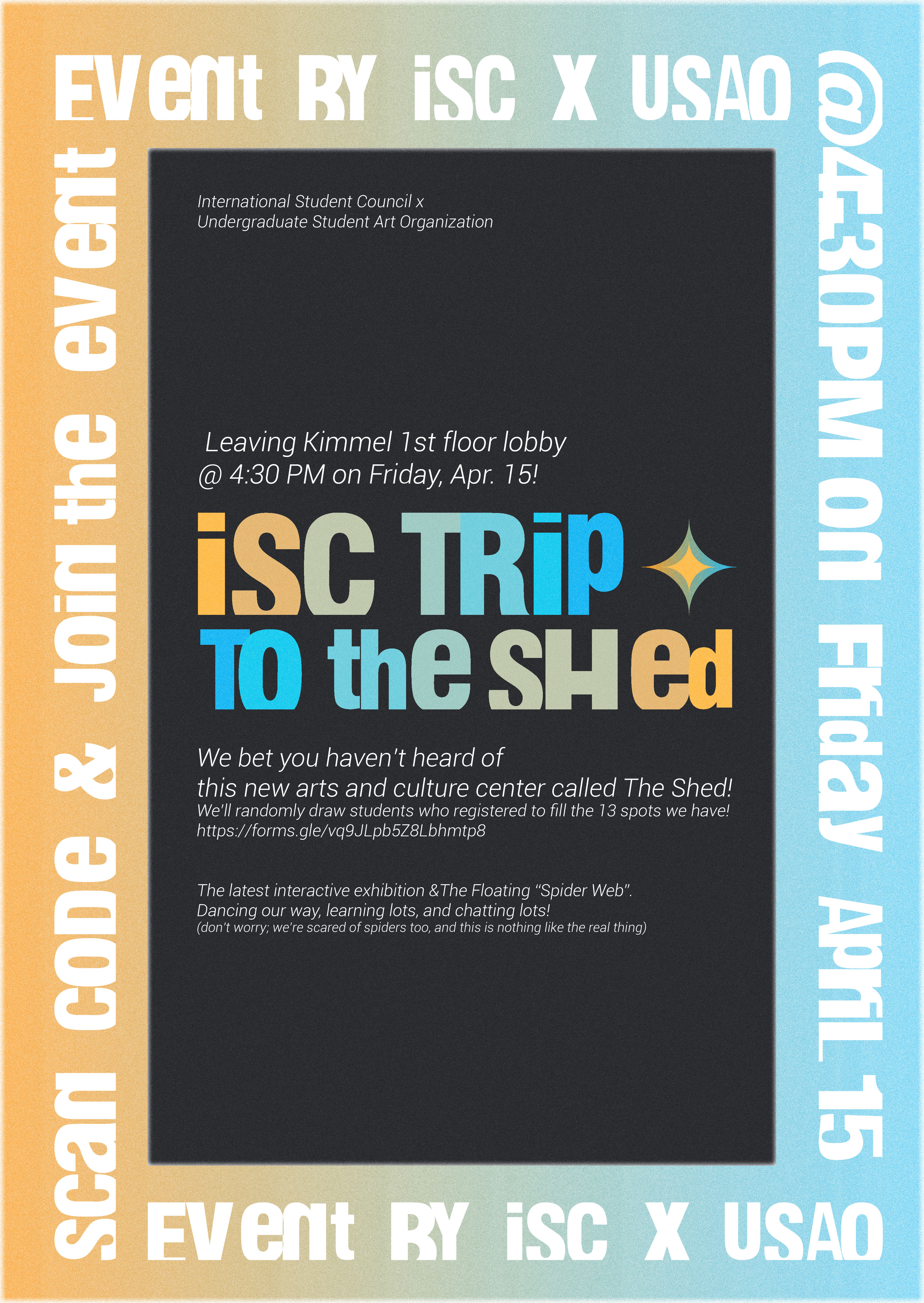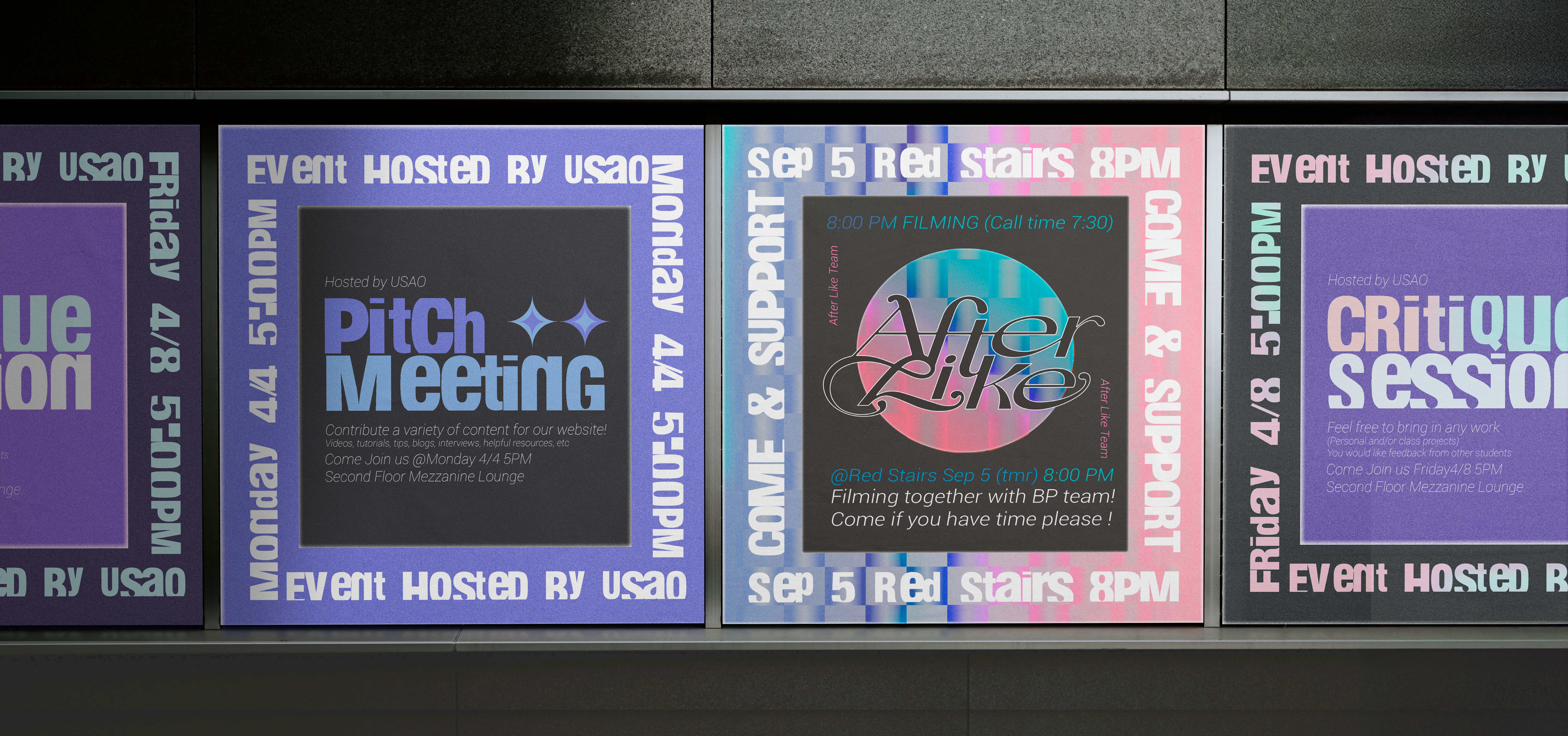 As the poster designer of Undergraduate Studio Art Organization, I have designed a set of poster for different events and announcement. posters were displayed in the Barney Building of NYU as well as Official Instagram of School of Steinhardt, Studio Art account.