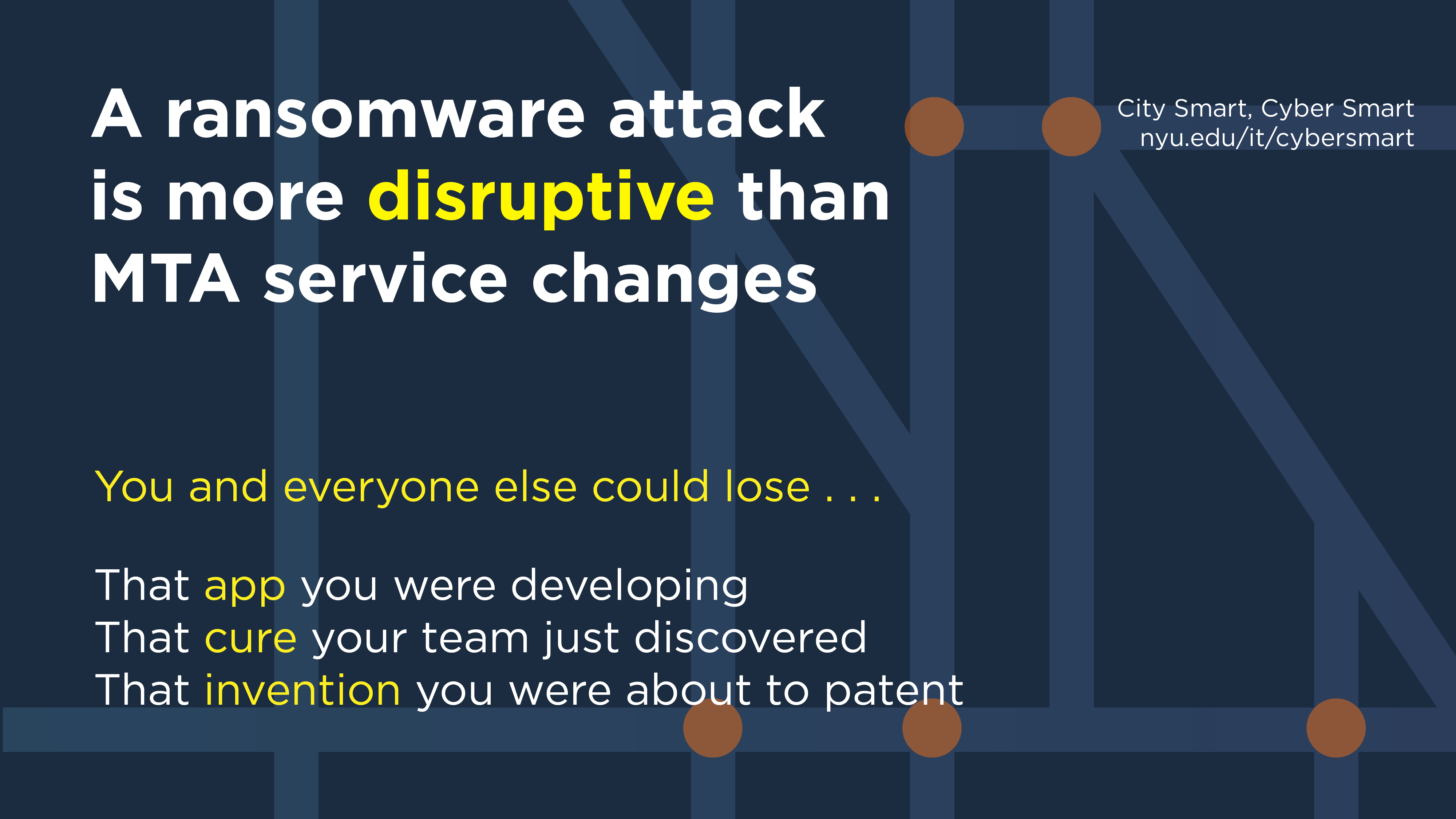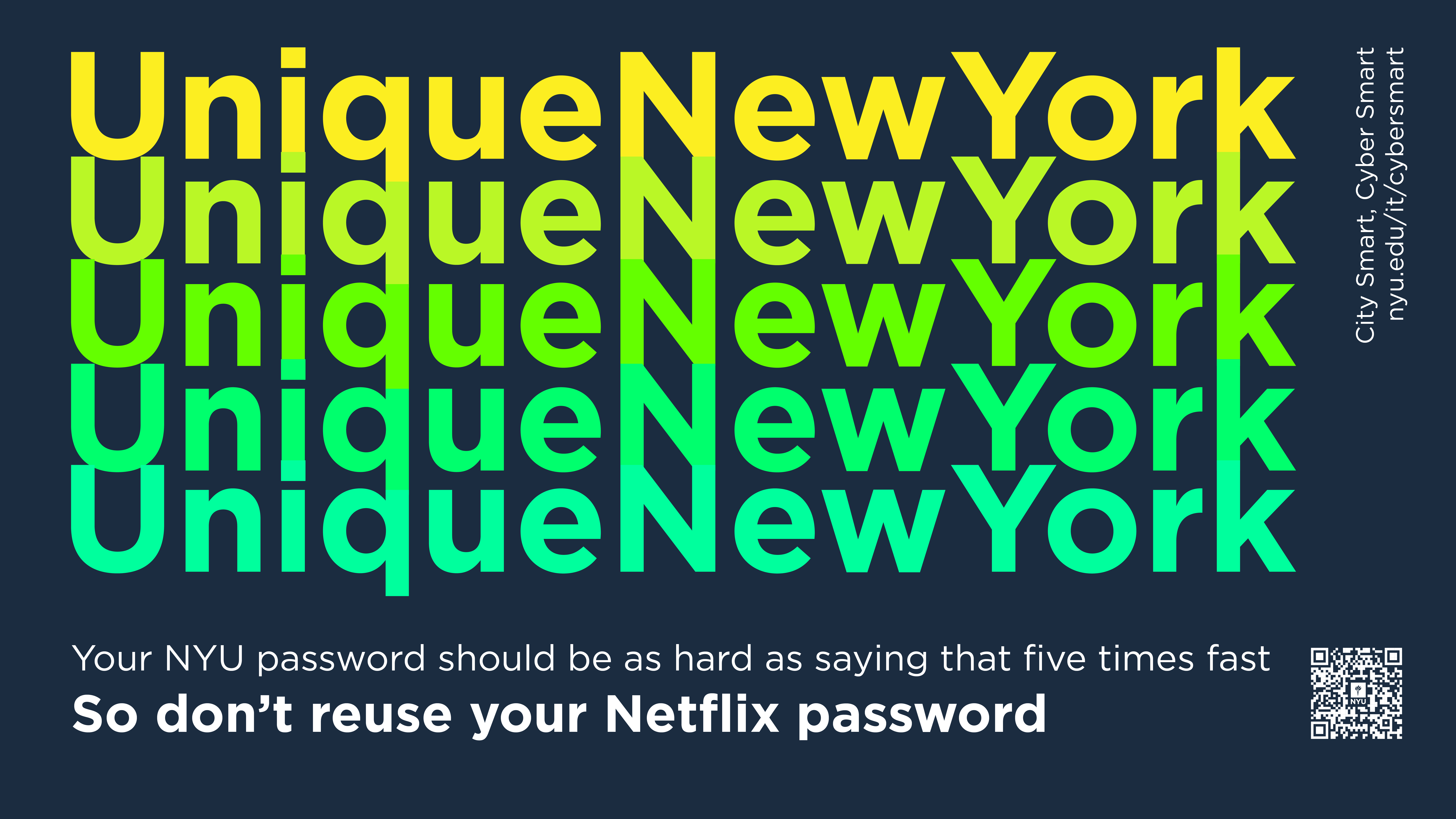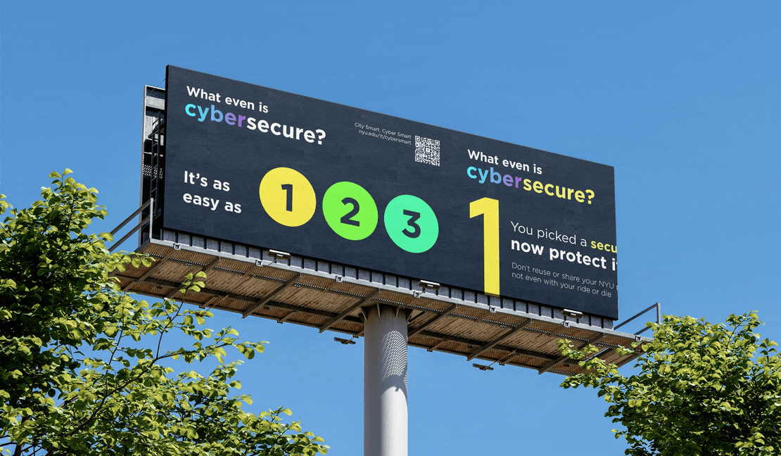 For NYU IT’s 2023 "City Smart, Cyber Smart" campaign, I designed over 40 signage pieces that paralleled NYC’s MTA system with cybersecurity. Using track lines, route numbers, and bold colors, the visuals made digital safety feel familiar and navigable. Just like the subway, which may seem chaotic at first but is ultimately learnable, cybersecurity can be approached with the same confidence. The campaign was featured in Educause’s 2024 Horizon Report for its impactful, community-focused approach.
