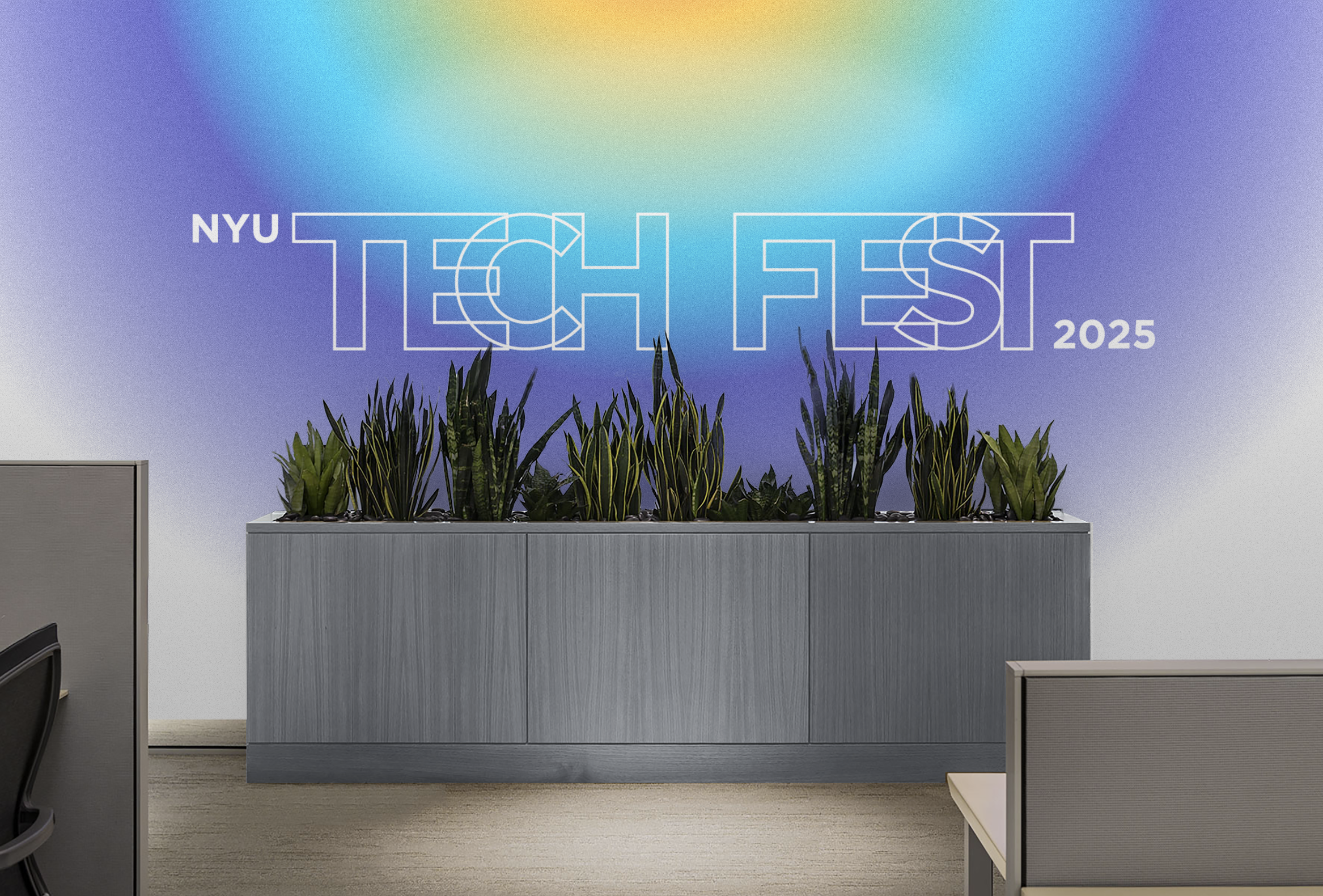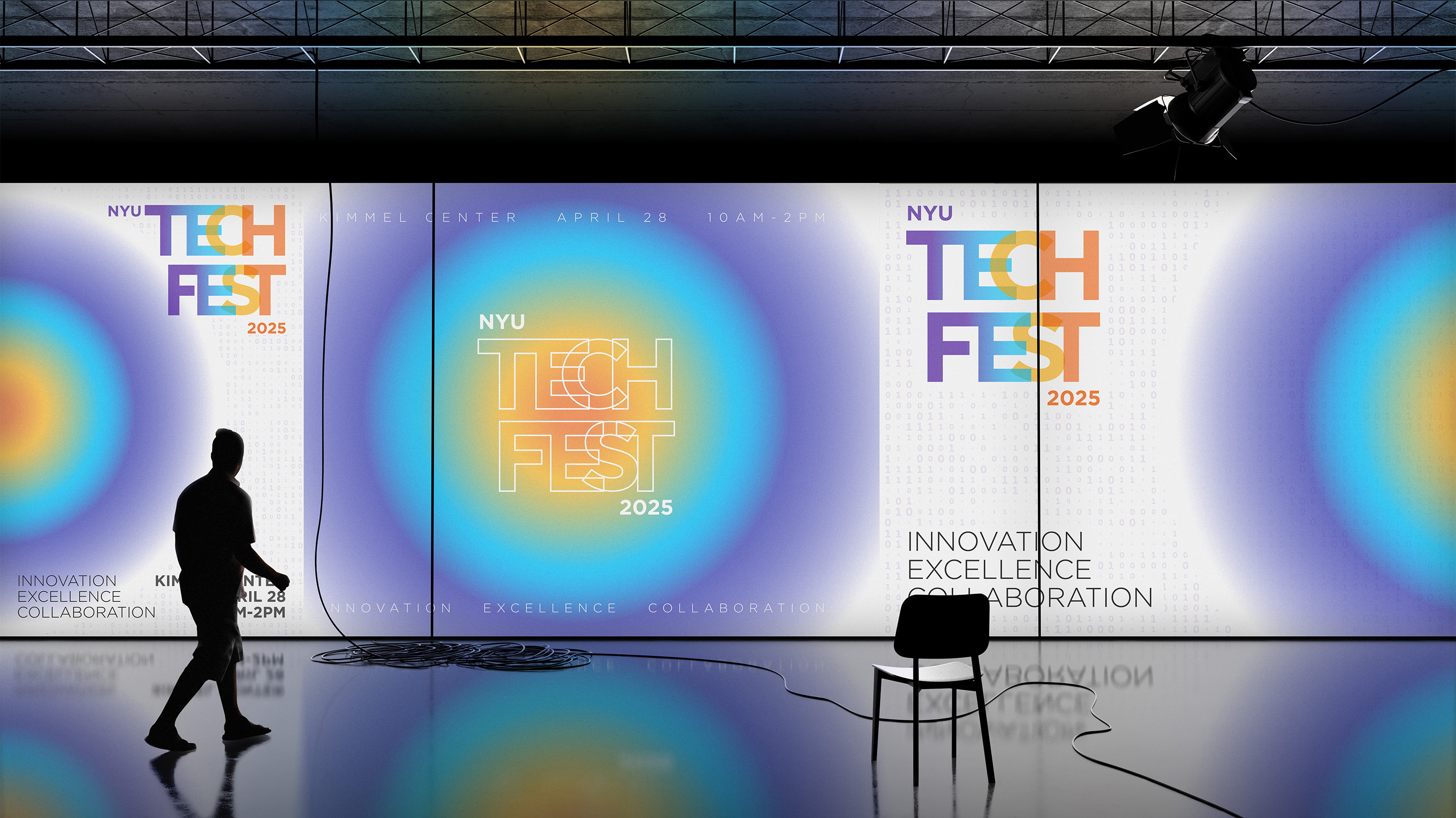 The central gradient circular visual symbolizes the energy of innovation, reflecting the forward-moving nature of technology and its ability to connect and propel us. The design celebrates the future of technology, grounded in NYU’s academic culture.