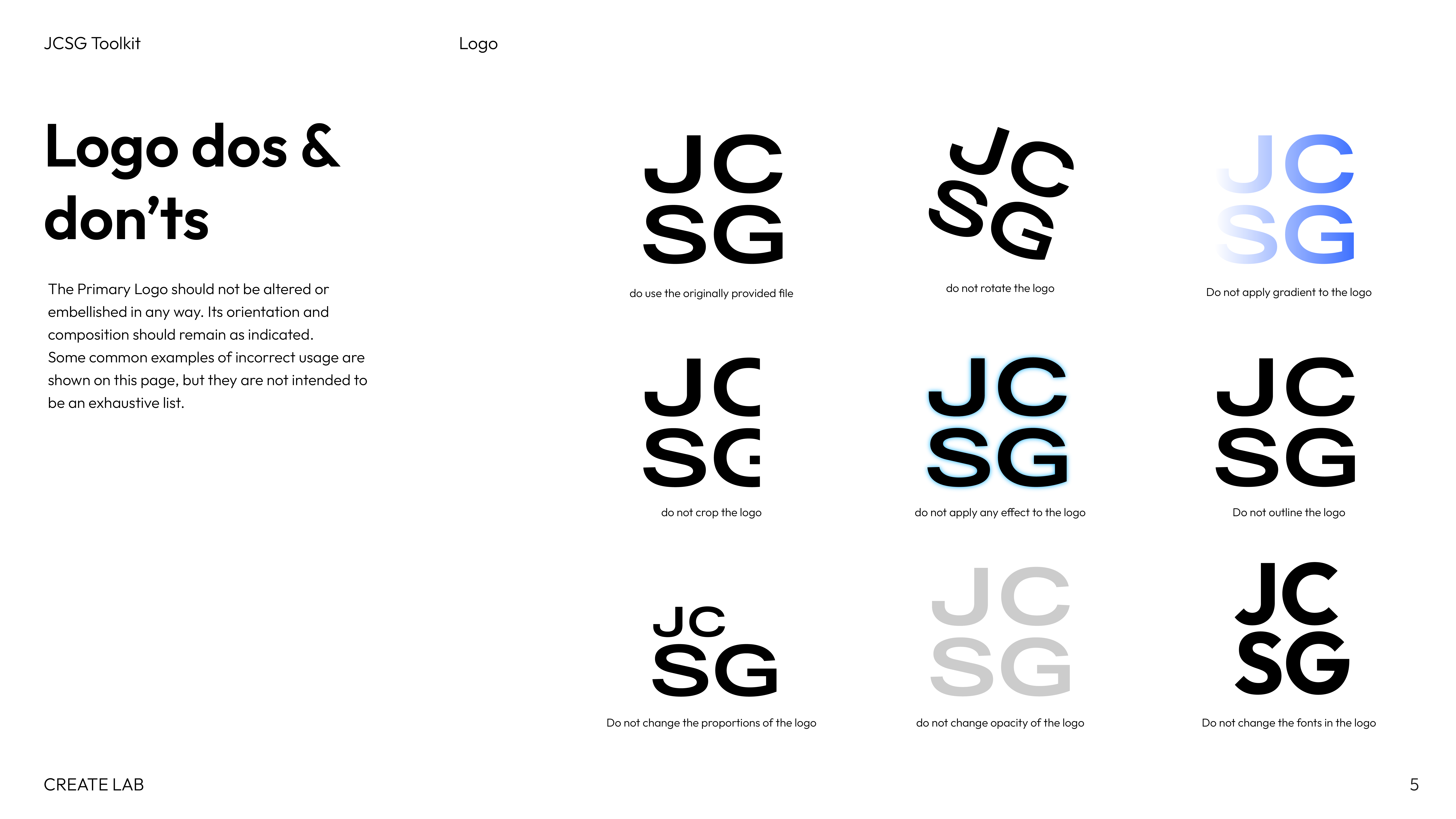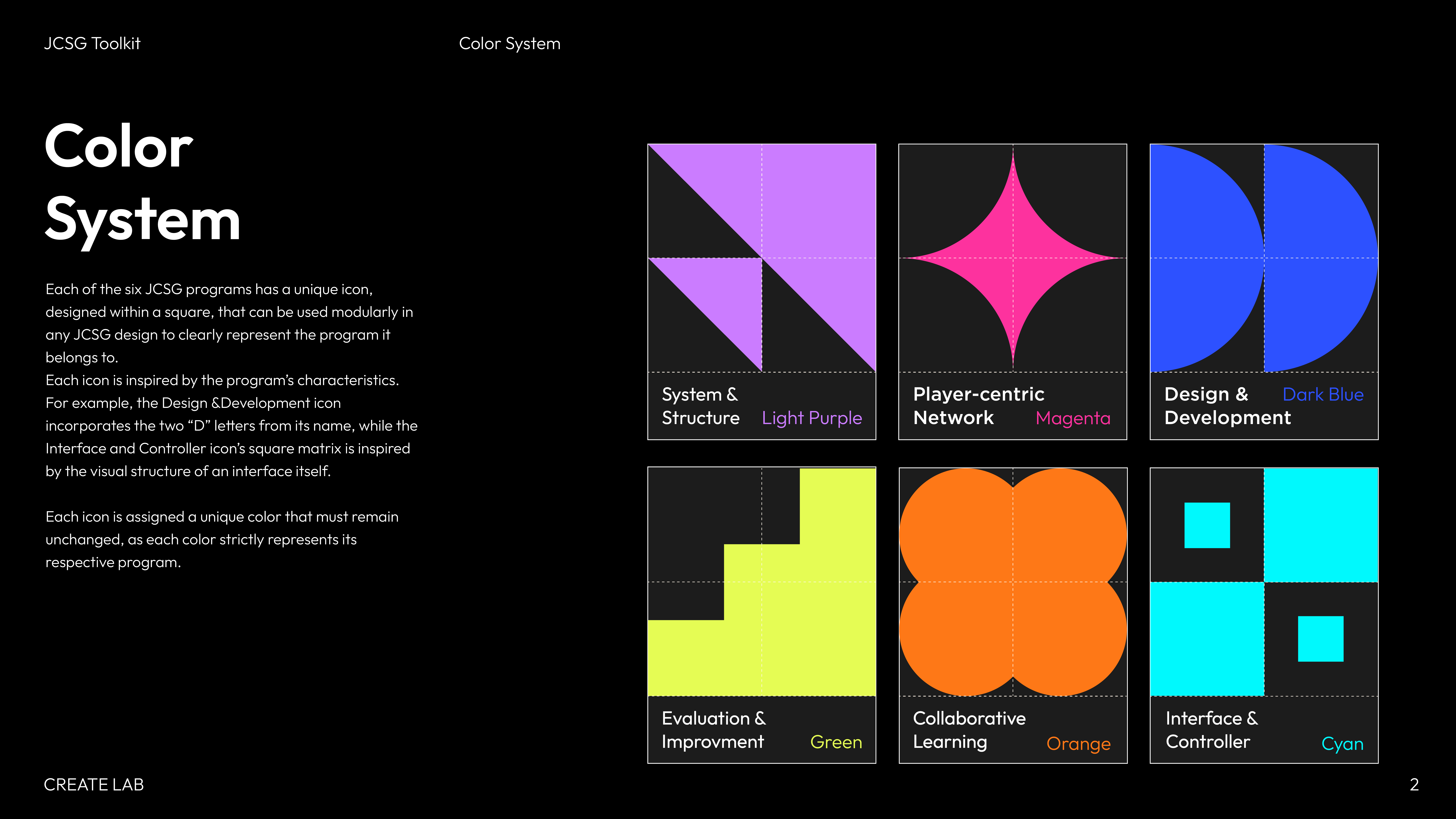 The JCSG 2024 identity is built around a modular system of six abstract icons, each representing a core